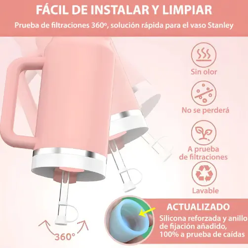 ¡Convertí tu Stanley en un vaso 100% a prueba de fugas! Este kit de silicona de grado alimenticio sella los puntos críticos de tu vaso, evitando derrames accidentales incluso si se tumba por completo. Compatible con modelos de 30 oz y 40 oz (versiones 1.0 y 2.0).